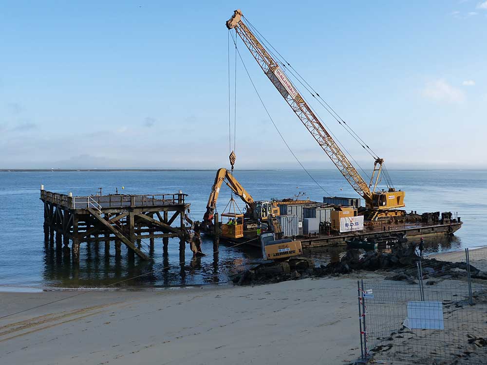 Au tout début du siècle dernier, le maire d'Arcachon, James Veyrier-Montagnères était un visionnaire et un bâtisseur, et il décida de doter sa ville de jetées, où les gens pourraient aller se promener ou pêcher ou bien encore admirer la splendeur du bassin. Il fallait cet homme pour mettre un peu d'ordre : il y avait depuis des décennies le débarcadère d'Eyrac, mantes fois détruit par la tempête et inlassablement reconstruit; il y avait aussi le "promenoir" de la mairie, une avancée sur le bassin, la jetée de la Chapelle, indispensable à la traditionelle fête d'Arcachon, en mars quand le curé ou l'évêque de Bordeaux venait bénir les bateaux des marins, des pontons privés à Saint-Yves ou à la villa Hyowawa, le tout en bois et donc fragiles. Pour résister aux éléments, les nouvelles jetées seraient en béton armé, un matériau insensible au feu et réputé quasiment indestructible. Il y en aurait une au Moulleau, une deuxième à la Chapelle, une troisième à Legallais, une quatrième à Thiers et enfin une cinquième à Eyrac. En 1904 Arcachon disposait donc d'un ensemble architectural unique de 5 jetées: il ne reste que celle d'Eyrac pour témoigner de l'oeuvre de ce bâtisseur. La jetée du Moulleau a changé de place au début des années 1970, pour passer à droite du GrandHôtel du Moulleau, celle de Legallais a disparu depuis longtemps. On a refait la jetée Thiers dans le genre "joli", interdite aux pêcheurs, pour en faire un embarcadère et un lieu de "déambulation". Il restait la jetée de la Chapelle, bien aimée des pêcheurs, des enfants dres familles. Elle n'existe plus. La nouvelle doit être prête fin mars 2014 pour la fête d'Arcachon. Pourvu qu'elle ne soit pas "jolie". (Toutes les photos de l'agonie et de la mort de la jetée ci-dessous sont cliquables pour en voir des versions agrandies. Photo N., E., et F. Courtaigne) 8/01/14